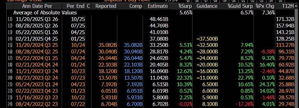 Weak Hopper matters on the margin, but if you’re forward-looking, it’s, once again, eyes on Blackwell. Considering they just put up 90%+ revenue growth, Nvidia shares are cheap (~34x CY-ish 25x earnings). Blackwell’s success is what will make this EPS real or not. And while slightly disappointing, this isn’t a shocking quarter.